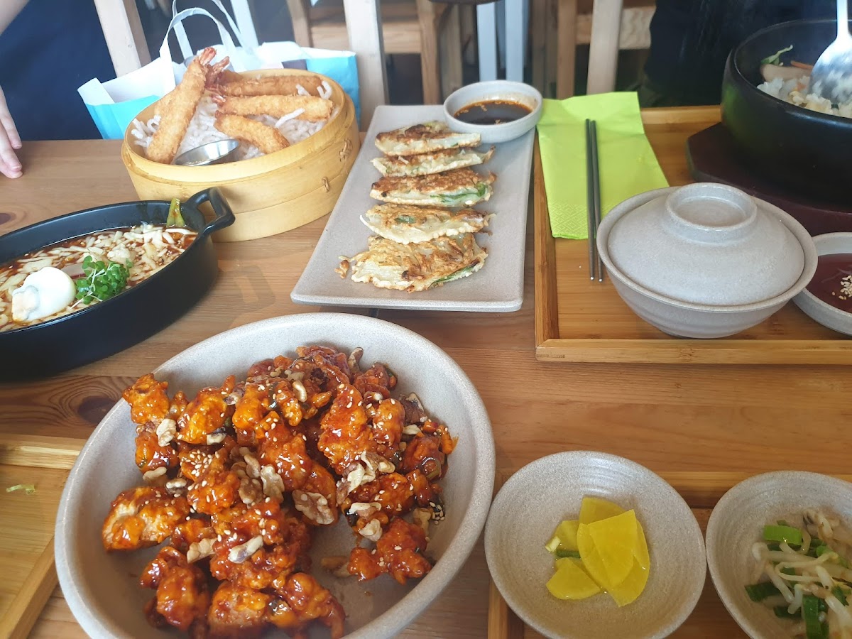 Authentic Korean Food prepared by a Korean lady. Crispy fried chicken and pan cake. Really yummy!